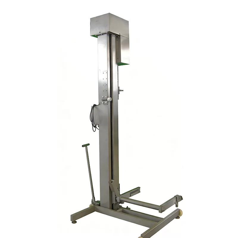 The elevators produced by our company are available in two types: mobile and fixed models. The Zhenglin elevator is designed to work with 200L standard meat trucks and serves as a lifting device to raise materials to a certain height, dumping them into the hopper of the processing equipment to complete the feeding process. The machine is made of stainless steel and features a chain drive, making it durable, easy to clean, and visually appealing. The mobile version is equipped with a movable frame, allowing the equipment to be repositioned easily according to changes in the working site.